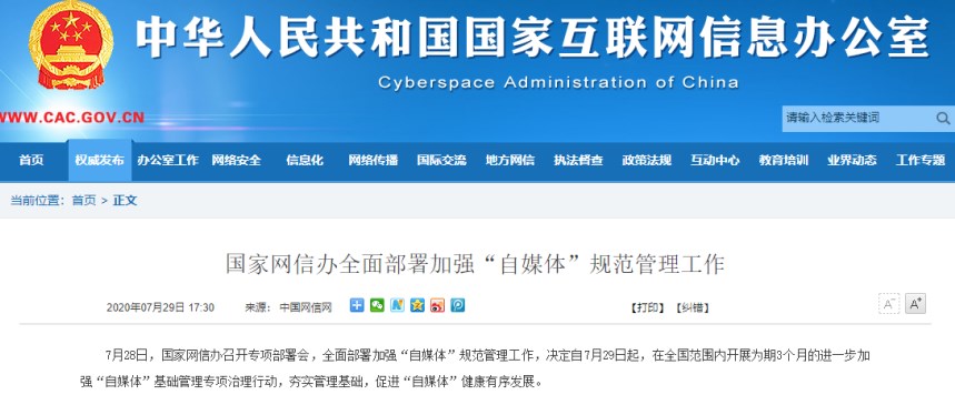 自7月29日起,在全國范圍內(nèi)開展為期3個(gè)月的進(jìn)一步加強(qiáng)“自媒體”基礎(chǔ)管理專項(xiàng)治理行動(dòng)