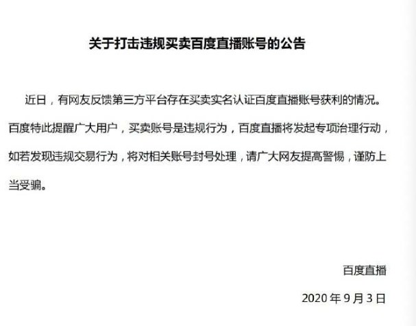 36氪獲悉,百度通過官方微博發(fā)布公告稱,近日,有網(wǎng)友反饋第三方平臺(tái)存在買賣實(shí)名認(rèn)證百度直播賬號(hào)獲利的情況。百度表示買賣賬號(hào)是違規(guī)行為,百度直播將發(fā)起專項(xiàng)治理行動(dòng),如若發(fā)現(xiàn)違規(guī)交易行為,將對(duì)賬號(hào)封號(hào)處理。